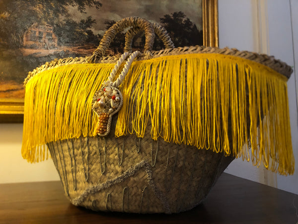 Borsa in palma nana intrecciata a mano, rivestita in tulle e rifinita in frange e passamanerie di seta colorata. Interno rivestito in lino con taschino. Chiusura con cordoncino in seta e bottone gioiello